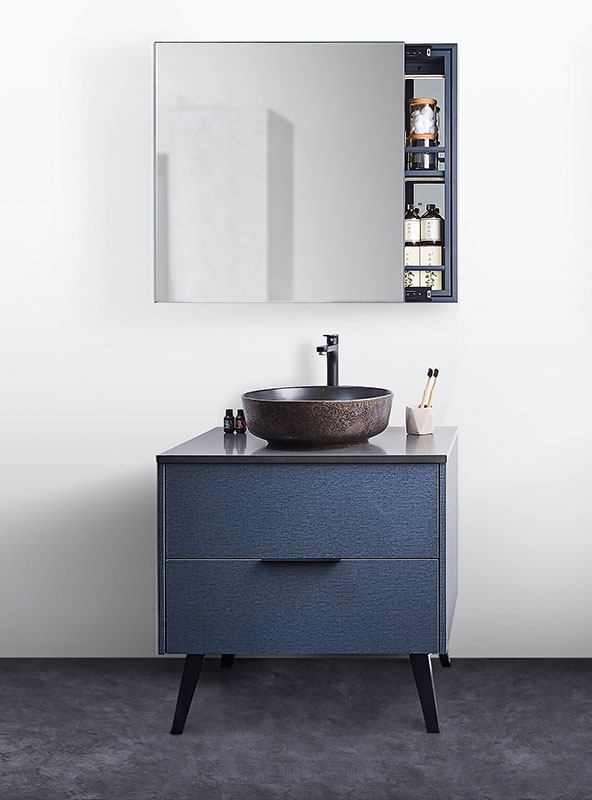 Multiple compartments provide extra storage space, hidden behind mirror.