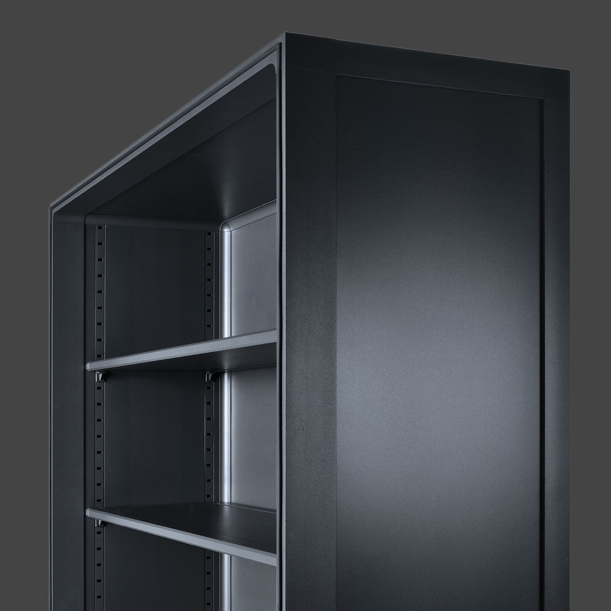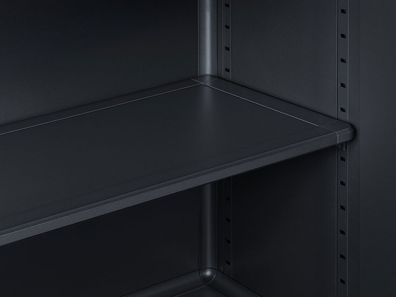 柜架上带有栓孔和板托可调节搁板间距,增加实用灵活性。
